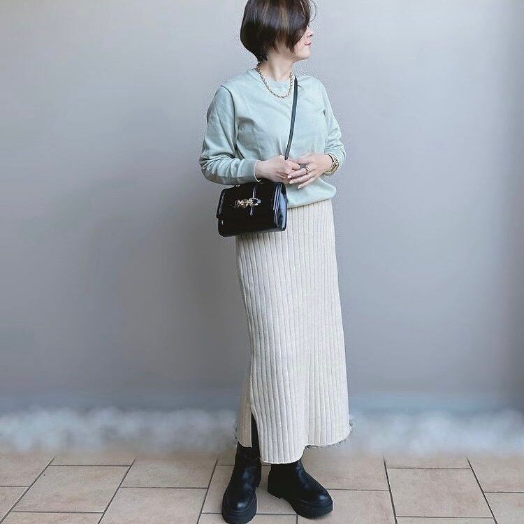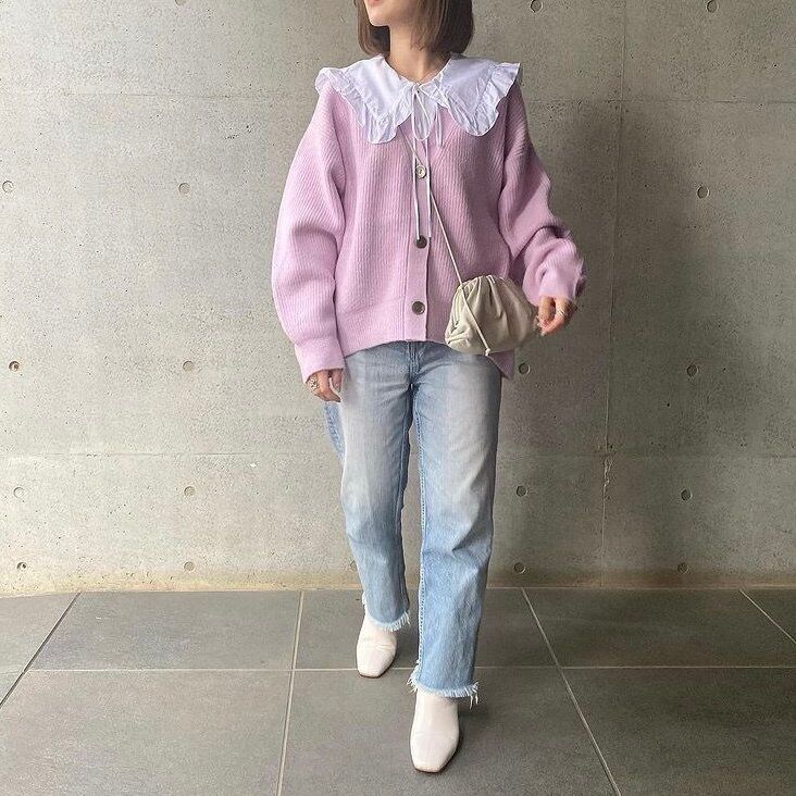 ふわっふわの肌ざわりも心地よいGUの「パフィータッチパフスリーブカーディガン/1,490円」は、ビッグカラーの襟をレイヤードさせて思い切りトレンドライクに寄せて。明るいトーンでまとめれば、春を意識した冬コーデが叶います。