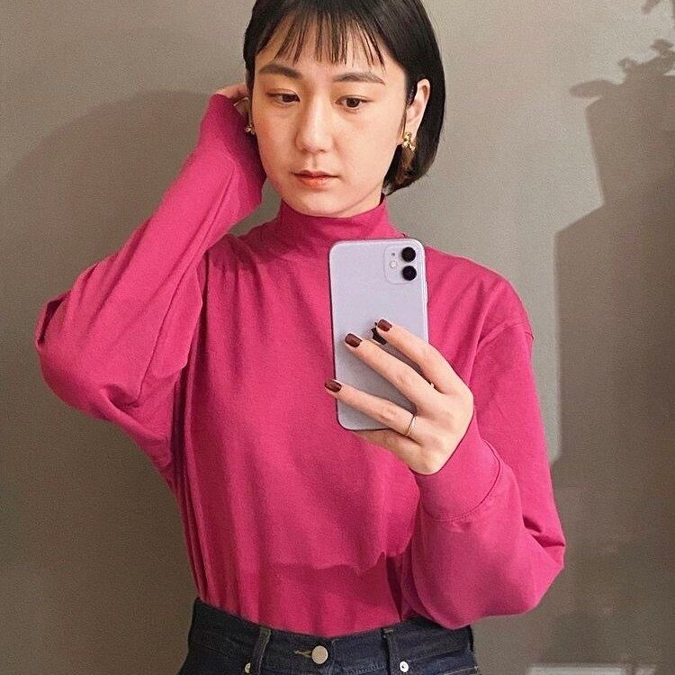 ハッと目の覚めるような深みのあるピンク色が新鮮!ユニクロの「ヒートテックコットンモックネックT/1,290円」はシンプルなデザインなので色で“遊ぶ”くらいがちょうどいい。ヒートテックなので保温性もばっちり。さらにコットン素材で春らしさもアップできます。