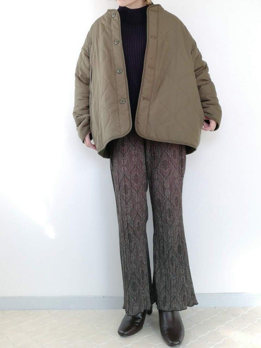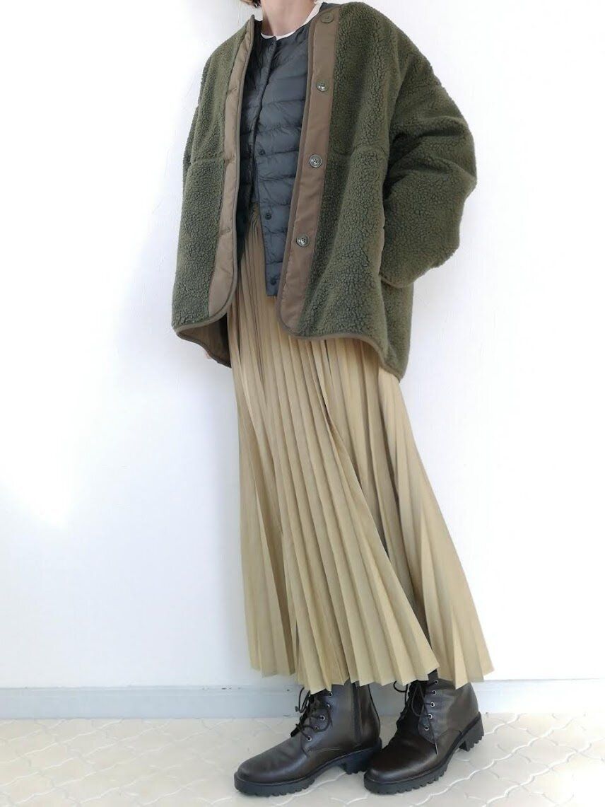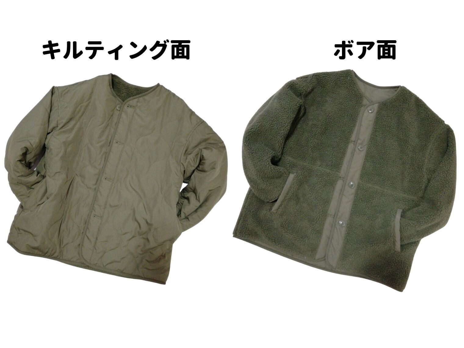 キルティング面は、茶色に近いカーキのような色合い。ボア面は、深めのグリーンでしっかりとした発色です。