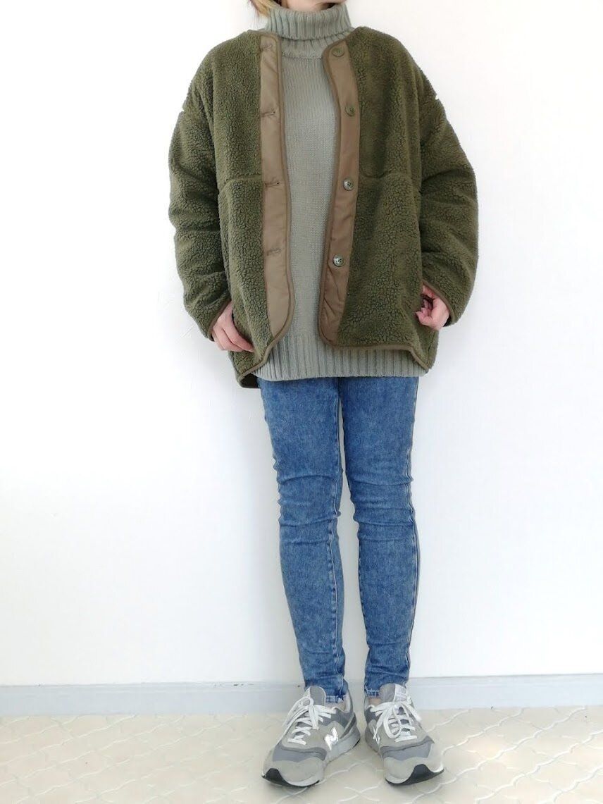 カーキのボアジャケット×スキニーデニムの超・カジュアルコーデ。