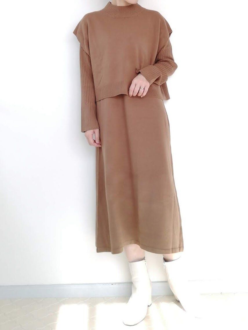 ニットベスト&ニットワンピースの2枚セット。そのまま着るだけで、今どきおしゃれなコーディネートが完成しちゃう優秀ワンピースなんです。