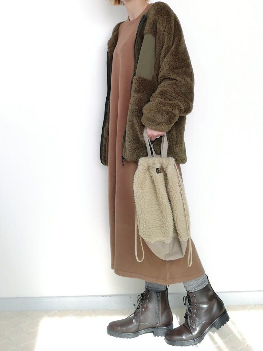 メンズライクなオーバーサイズのボアアウターを羽織ったカジュアルコーデ。