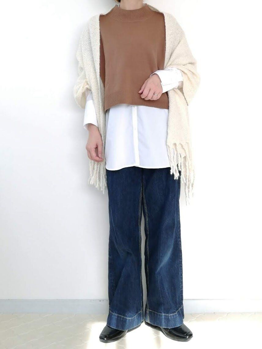 今っぽく見える、シャツとのレイヤードスタイルがおすすめです。