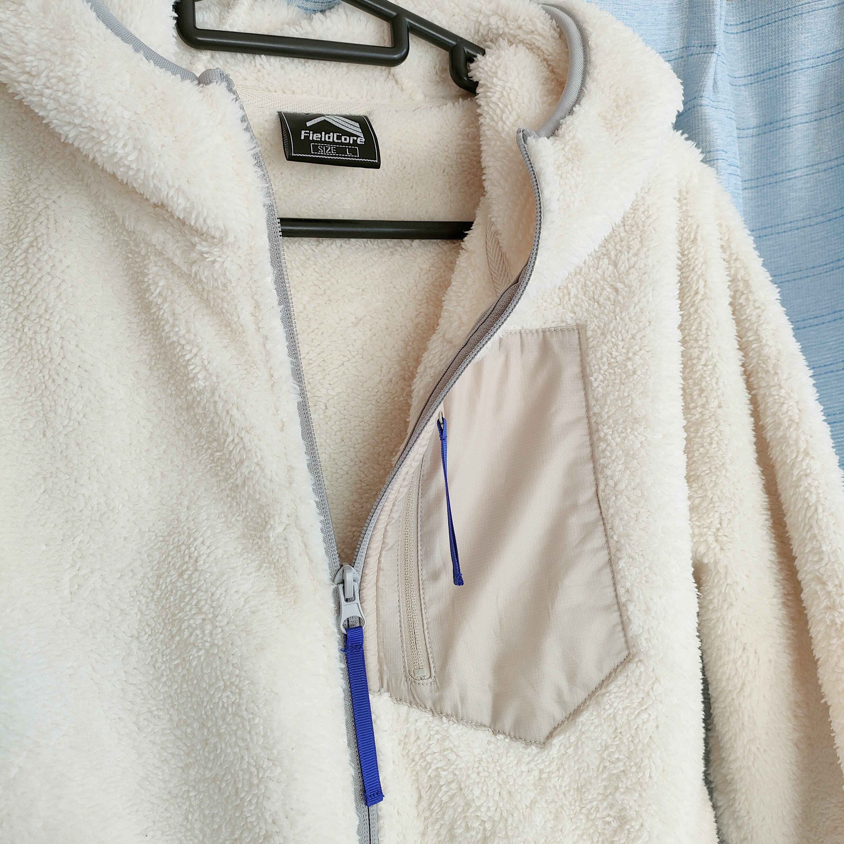この「防風ダブルボアフーディ」は左右に2つのポケットと、胸部分にチャックつきポケットがあります。こちらの胸ポケット部分はグレーの布地にさわやかな青の持ち手のチャックがついていて、カギなどの小物入れに使いやすいサイズです。
