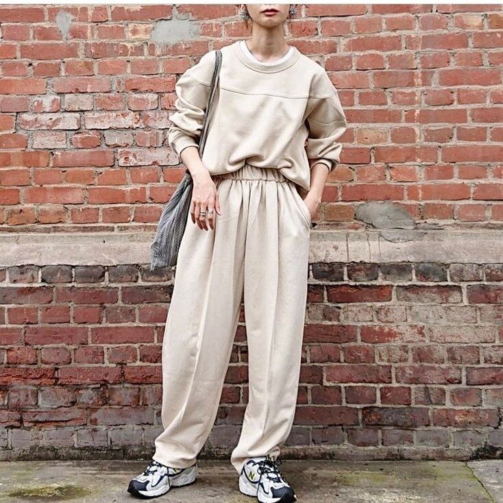 スウェット素材の上下を着ると、部屋着っぽく見えてしましがちですが、クタッとしすぎない素材が使われているので都会的なムードを出してくれます。特に「スウェットギャザーパンツ」のギャザーたっぷりなシルエットが革新的!