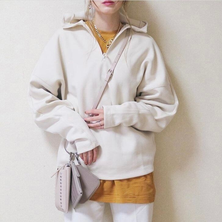 ハーフジップでインナーがしっかり見えるのでレイヤード上手に着こなせます。今までハーフジップアイテムを持ってなかった人も挑戦しやすい価格で◎。