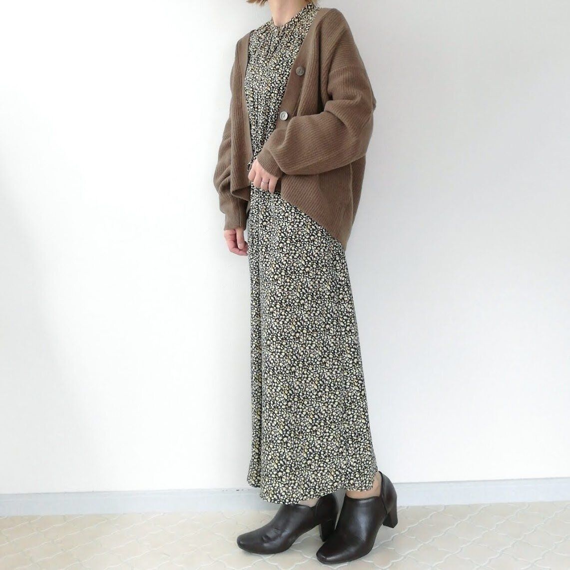 ゆるっと肩の落ちたカーディガンは、上半身を華奢に見せてくれる効果も。フェミニンなワンピースを、より女らしく仕上げてくれます。