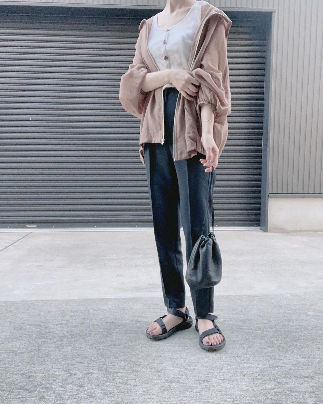 ゆるシルエットのライトアウターを羽織った、大人な印象のカジュアルコーデ。ベージュ×ブラックでまとめることで、カジュアルを上品な印象にランクアップできます。