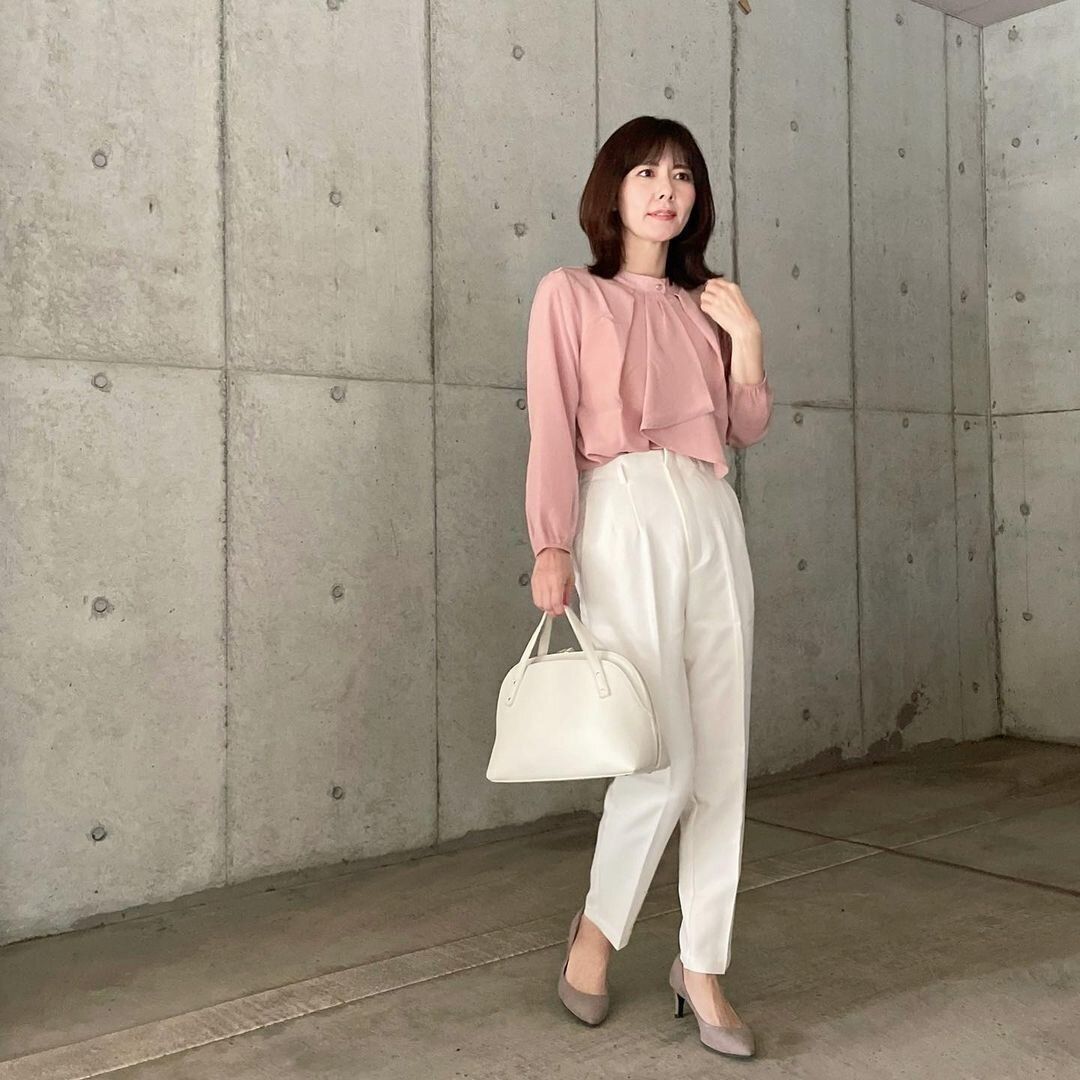 女らしいブラウス×ヒールパンプスで、柔らかい雰囲気のきちんとスタイルが完成。