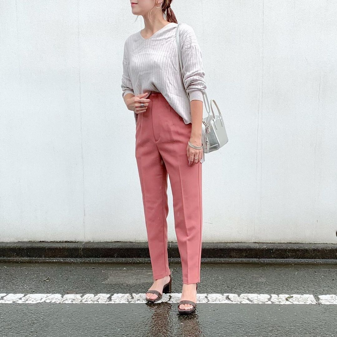 GUの「ハイウエストテーパードパンツ」、ピンクを使ったコーデ。