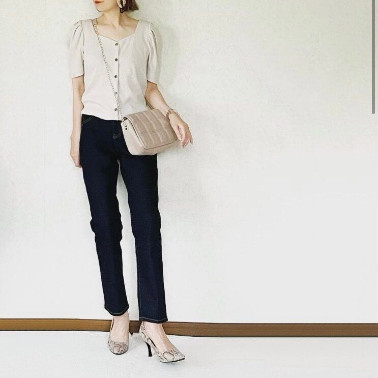 フロントボタンボリュームスリーブT(半袖)Qにデニムを合わせるなら細身のデニムがマスト。女性らしさを忘れない、上品なアラフォーのお手本デニムコーディネートが完成します。スタイルアップして見せたいなら濃いインディゴカラーのデニムがおすすめです。