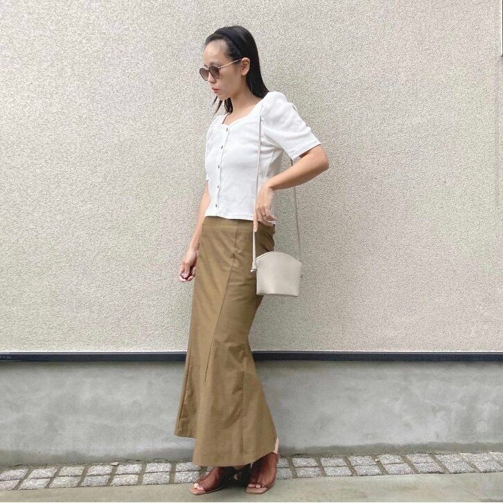 ホワイトのフロントボタンボリュームスリーブT(半袖)Qにベージュのボトムスを合わせたコーディネートは上品な印象を与えてくれるおすすめのコーディネート。