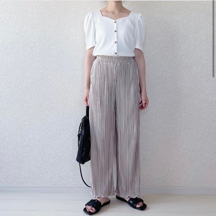 リラックススタイルに人気のプリーツパンツは、ゆったりとしたシルエットが特徴ですが、トップスにコンパクトなフロントボタンボリュームスリーブT(半袖)Qを合わせる事でメリハリが出て着やせして見せることが出来ます。