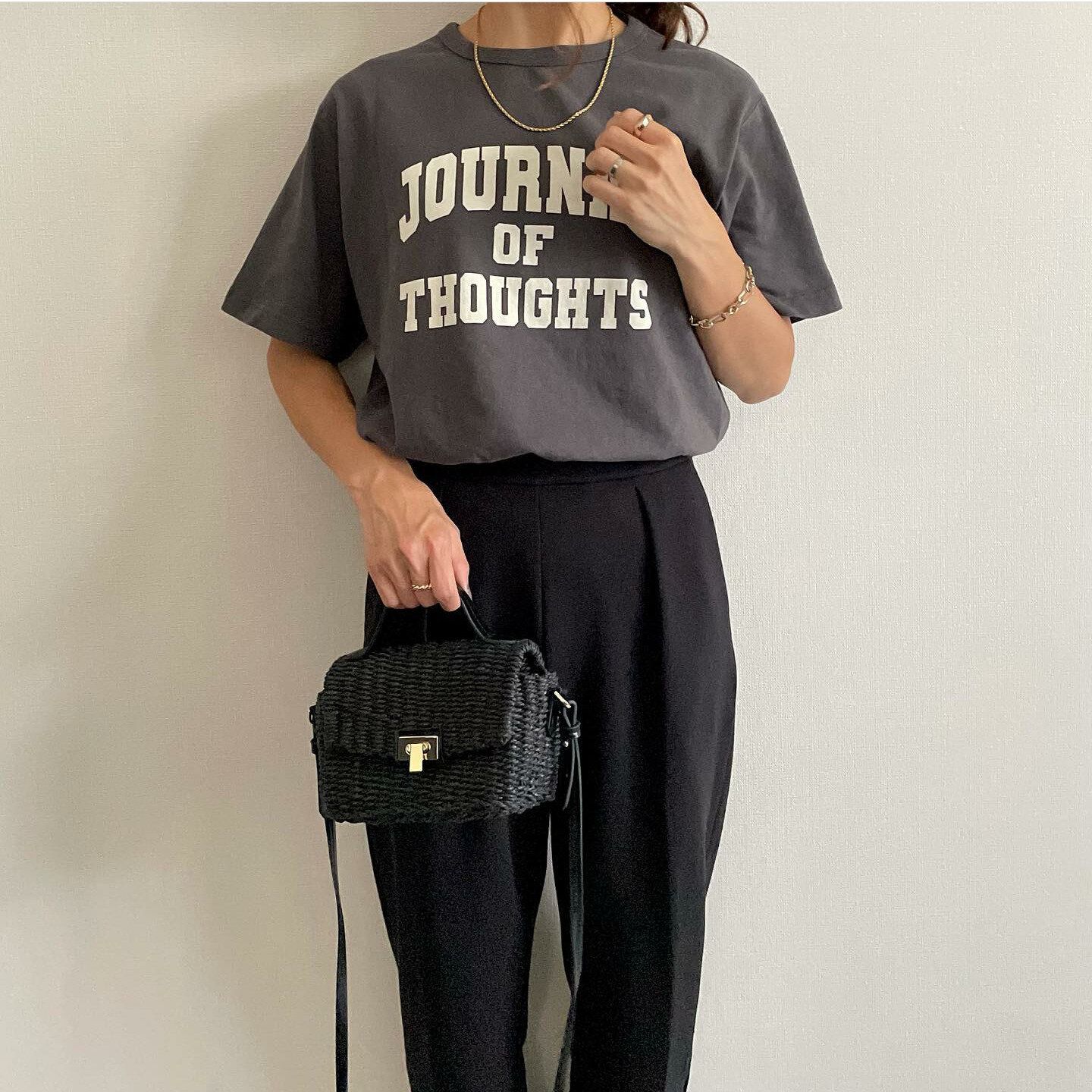 今回は、カジュアルアイテムをきれいめに着こなしていますが、きちんとしたシーンにも対応できるので幅広い着回しを叶えてくれます。着用されているTシャツは、GUの「カレッジロゴT」です。