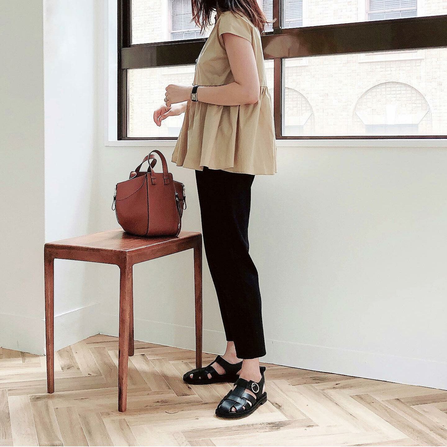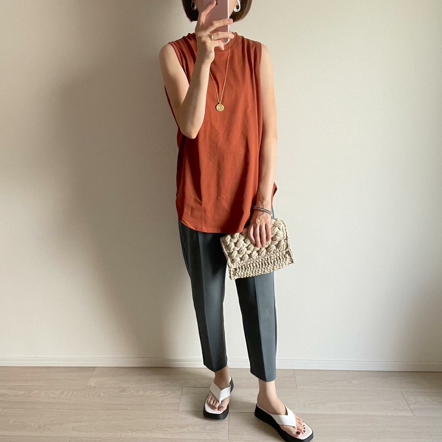 着用されているのは、ユニクロの「スムースコットンシャツテールT」です。涼し気な着こなしですが、色で秋らしさを発揮させて。