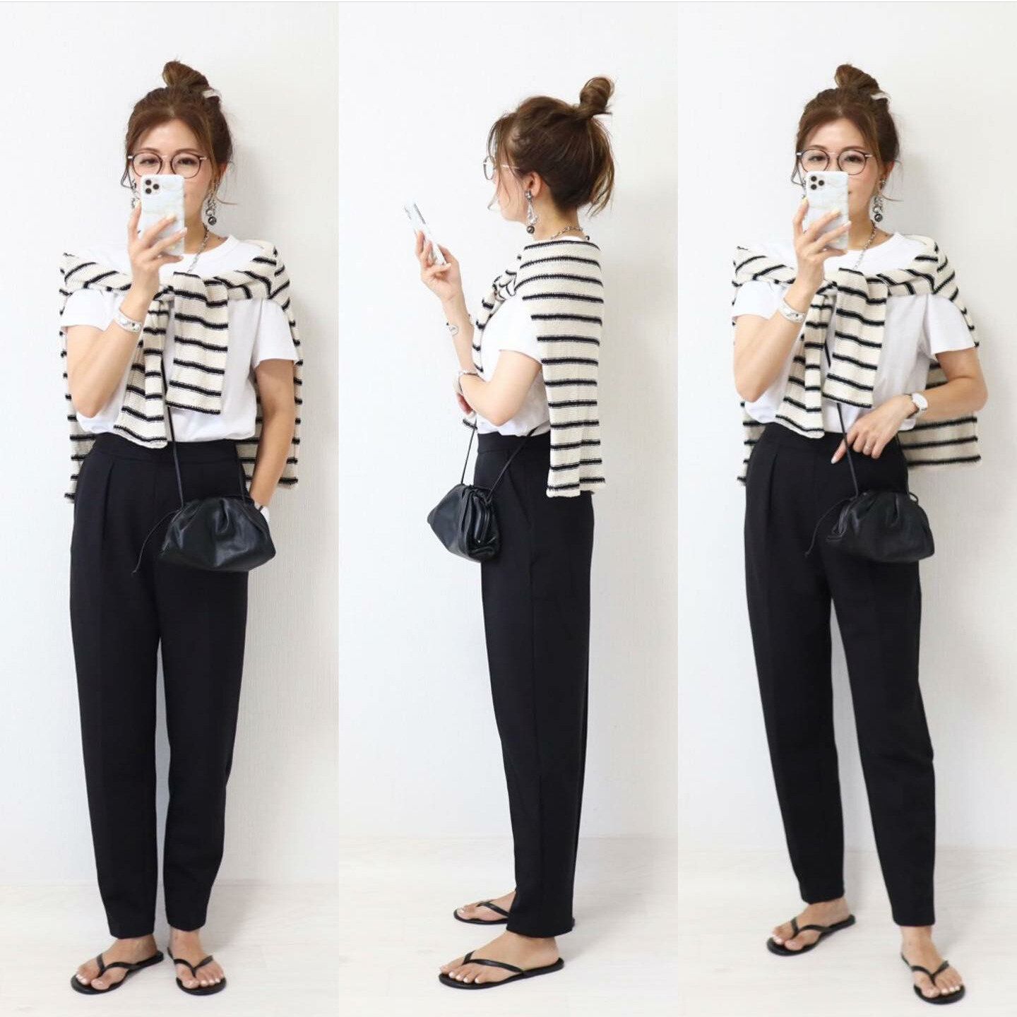 白Tシャツもクリーンな印象に。きれいめに見えますが、実は洗濯機で洗えるお手入れが簡単なカットソー素材なのもうれしいですよね!少し涼しい日は、肩掛けスタイルにチャレンジしてモノトーンコーデをブラッシュアップさせてみるのも素敵です。