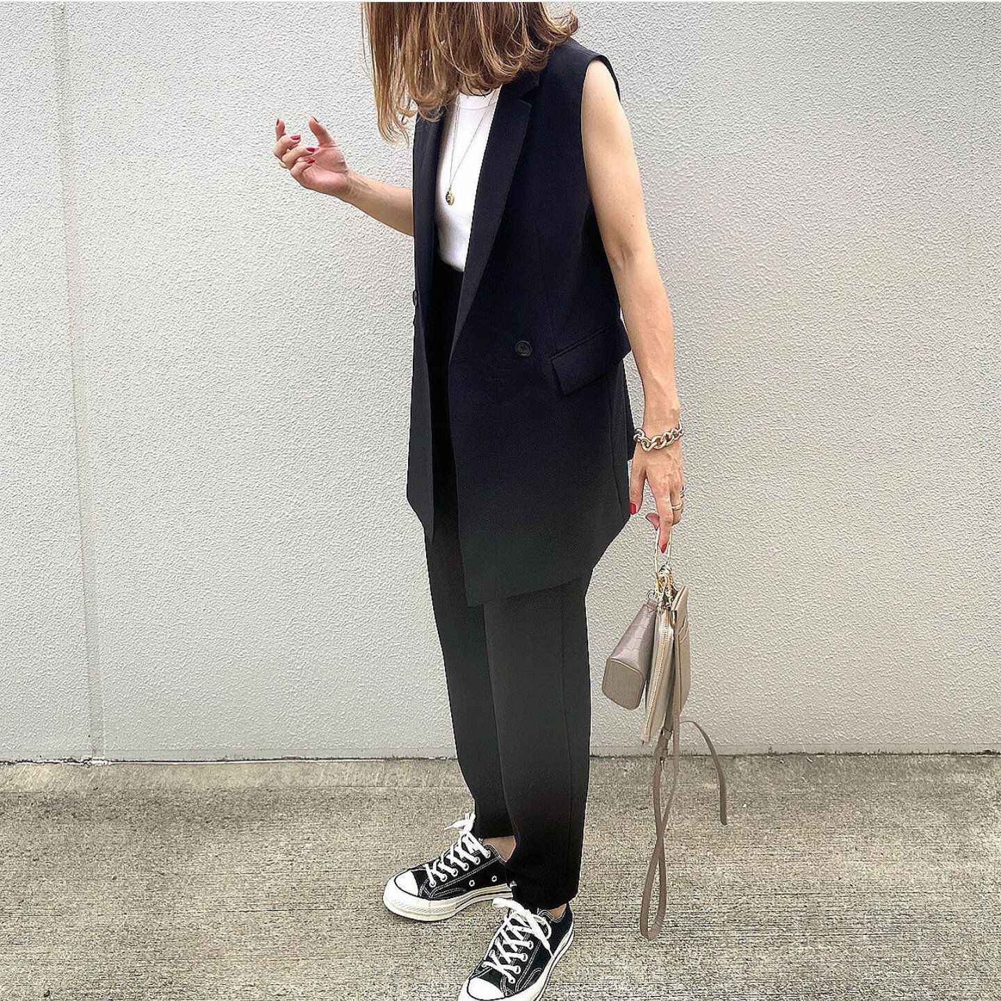 トレンド感漂うジレ風のベストは、GUのもの。モノトーンに徹すれば、トレンドアイテムも大人っぽく着こなせます。何を合わせようか悩みがちな新星のトレンドアイテムも、シルエット自慢の「ストレッチダブルフェイスイージーテーパードパンツ」なら、上手に着こなせます。