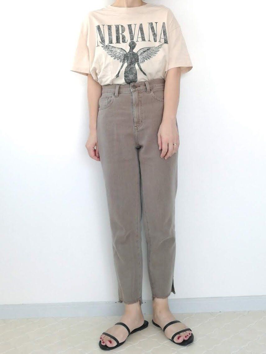 プリントTシャツ×デニムのカジュアルなコーデ。気軽なワンツーコーデは、いつも同じ組み合わせになりがち。