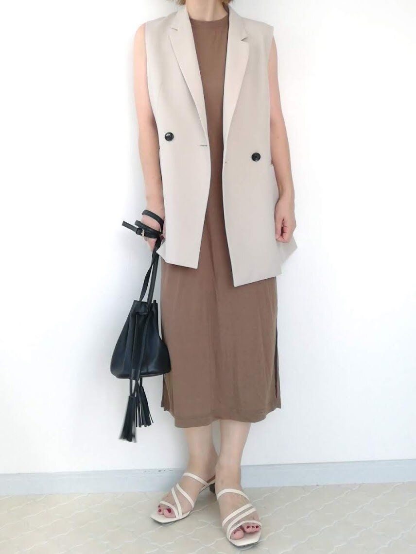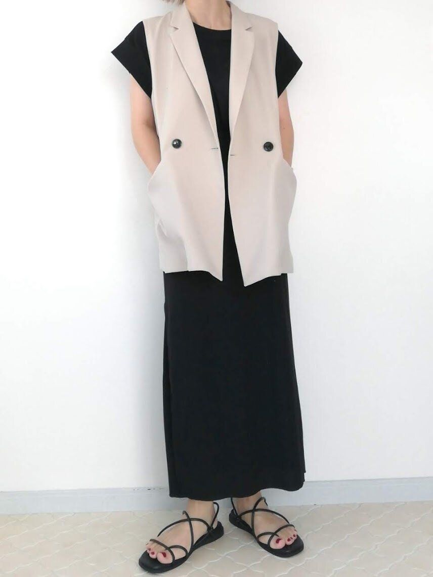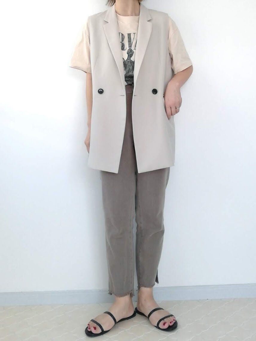 夏服にさっと羽織るだけで即トレンドコーデになれる!大人っぽいテーラード型ベストは、さまざまなレイヤードが楽しめる優秀アイテム。秋服に重ねてもOKなので、いま買って長く活躍してくれること間違いなしですよ。