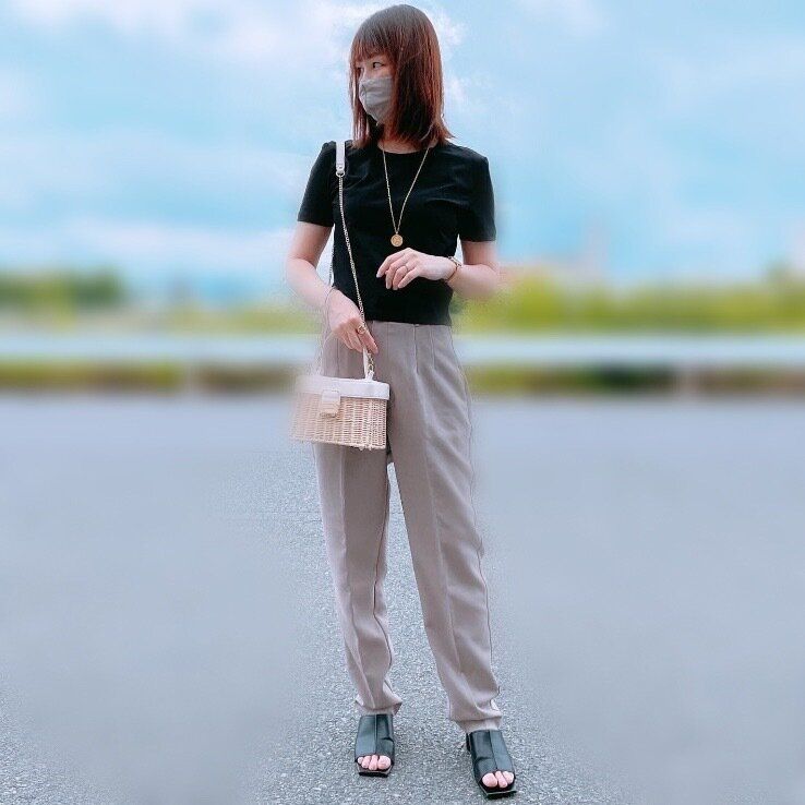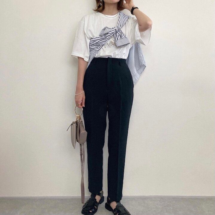 着回し力抜群のブラックのハイウエストテーパードパンツにシンプルなTシャツを合わせたコーディネート。シャツを巻くことでワンランク上のカジュアルスタイルの完成です。