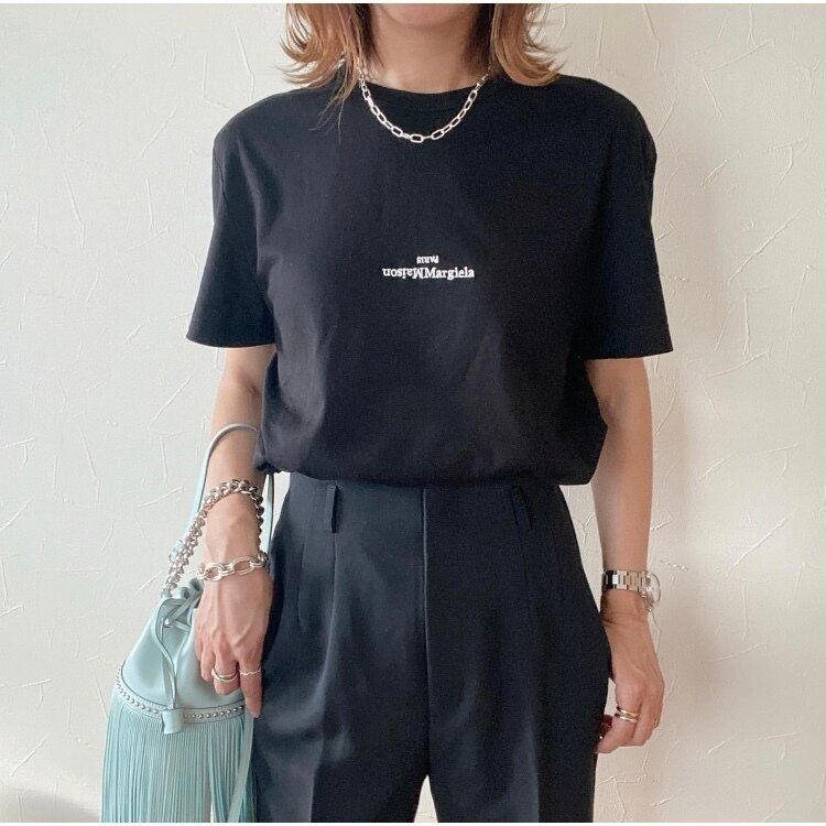 美脚効果の高いパンツなので、トップスはややオーバーサイズのTシャツを合わせてメリハリをつけることで、今年っぽい印象を与えています。