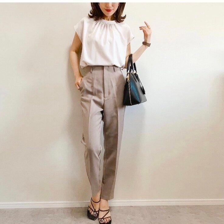 ベージュのハイウエストテーパードパンツに白のブラウスを合わせたレディなコーディネート。