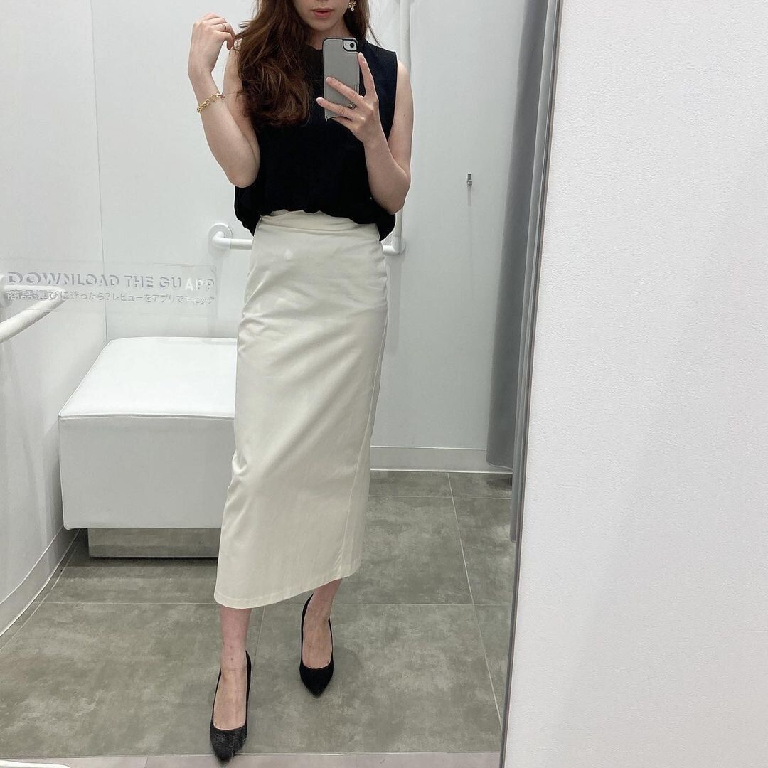 ブラックを選べば着やせ効果も抜群!きれいめなタイトスカートに合わせて、大人な雰囲気漂う夏コーデに。