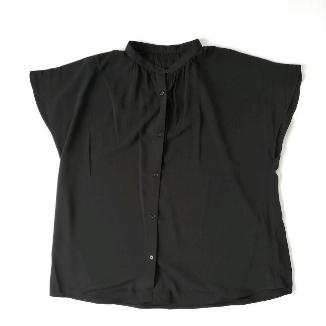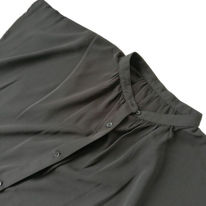 トレンドのバンドカラーで、ふつうのシャツより差がつく1枚。胸元のギャザーとさりげなくフレアな袖で、ほんのり女性らしい雰囲気で着ることができます。