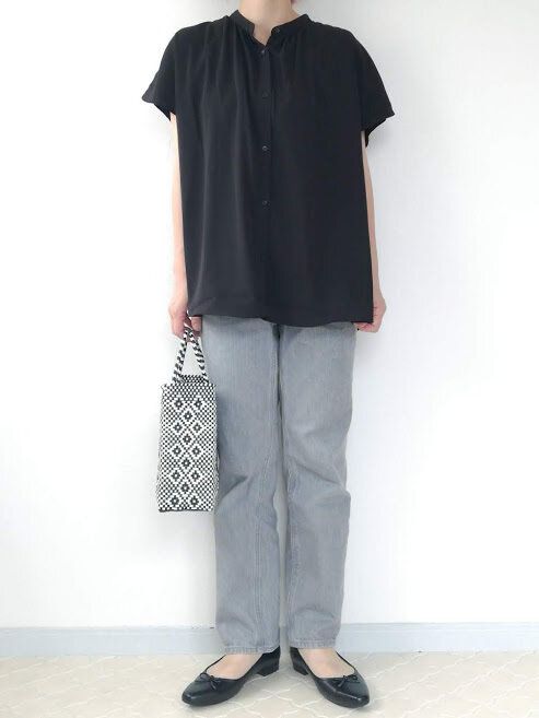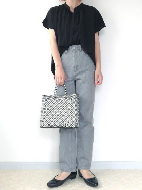 デニムと合わせたカジュアルなスタイリング。かごバッグやバレエシューズのナチュラルな雰囲気でまとめた着こなし。