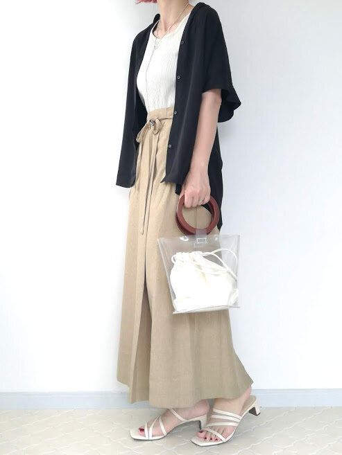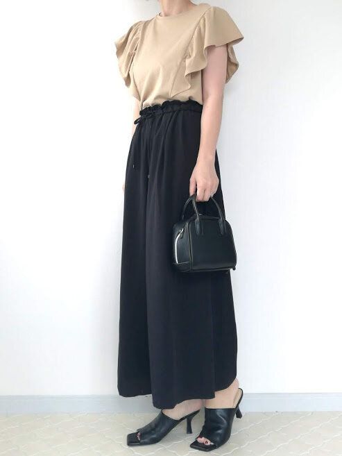 シンプルなボトムにトップスの甘さが引き立ち、大人のフェミニンコーデが完成!ベージュ×ブラックで統一して、より落ち着いた雰囲気に。