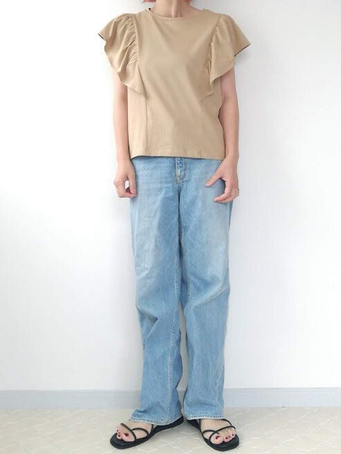 甘さのあるトップスとカジュアルなデニムが、なんだかちぐはぐな印象……。若さでカバーできない40代には厳しいコーデかもしれません。