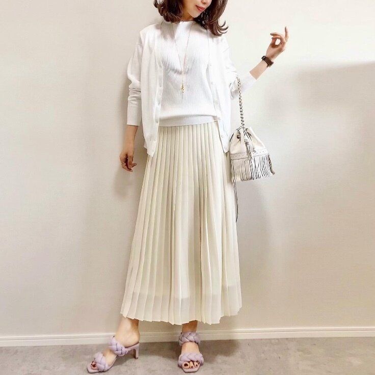 膨張するイメージのある白も、縦のラインを強調した「UVカットスーピマコットンフレンチスリーブセーター」にプリーツスカートを合わせればIラインのすっきりとしたホワイトコーディネートが完成します。