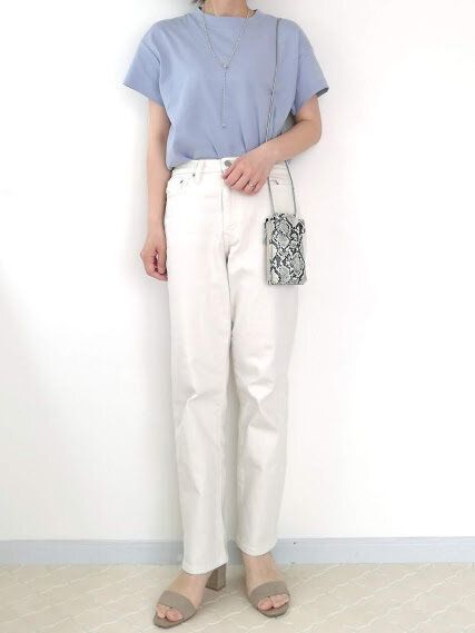 ホワイトデニムに合わせたきれいめ大人カジュアルコーデ。ライトブルー×ホワイトでさわやかで品のある印象に。パイソン柄のショルダーバッグでポイントをプラス。