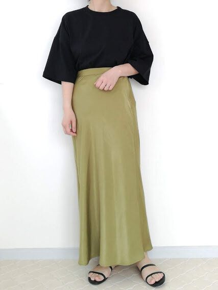 旬なサテンスカートに合わせてカジュアルダウン。トップスインして今っぽいシルエットにするのがポイント!