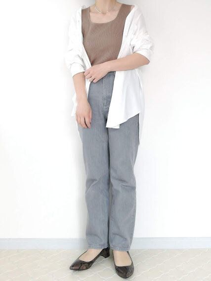旬なバンドカラーシャツのインナーに。カジュアルに寄りがちなデニムを、デコルテを見せることでさりげなく女らしい雰囲気に。