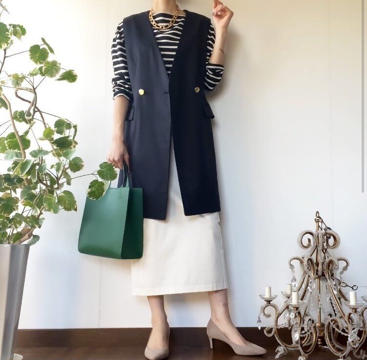 タイトなスカートを合わせることで、ボーダーを着ても縦のラインに目線が行くので着やせ効果も期待できますし、襟が無いジレなので、すっきりとした印象を演出してくれます。