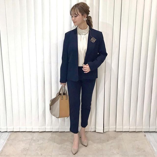 オールネイビーのセットアップは、明るいクリーム色のシャツをインナーにすることで顔まわりを明るく。小物やアクセサリーはハイブランドのものを合わせて、品のよいセレモニーコーデに。