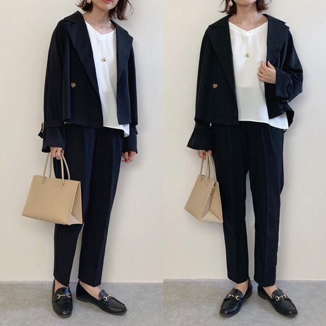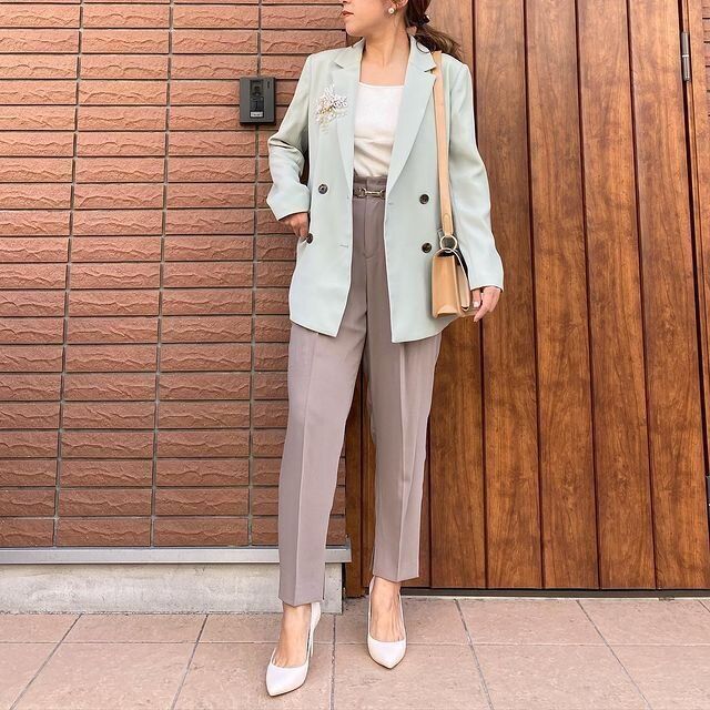 GU「ノーカラージャケット」3,990円(税込)・GU「テーパードアンクルパンツ」1,990円(税込)・GU「マシュマロポインテッドパンプス」2,490円(税込)を使った卒園式ママコーデ。