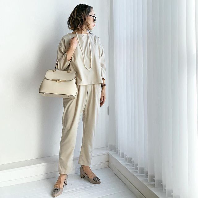 シンプルなセットアップはネックレスを足して華やかさをプラスして。