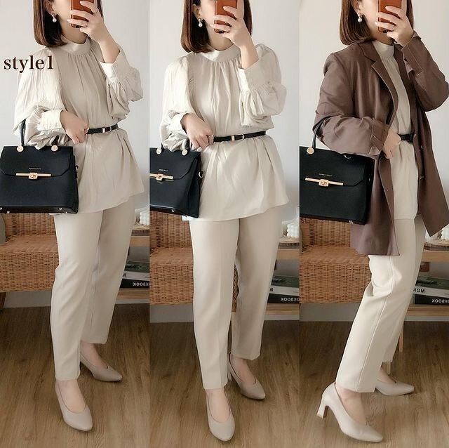 GRL「ベルト付きブライトサテンブラウス」1,799円(税込)・GRL「ベルト付きテーパードパンツ」1,699円(税込)・GRL「デザインヒールパンプス」1,699円(税込)を使った入園・入学式ママコーデ。