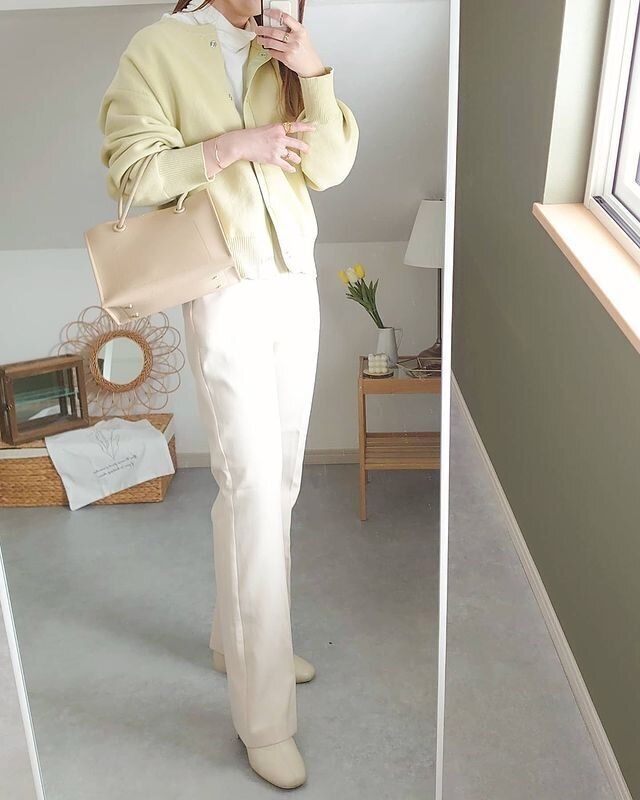 淡いグリーンのカーディガンで、コーデを春らしく。ほかのアイテムをホワイト系でまとめて、優しい印象の大人な着こなしに。