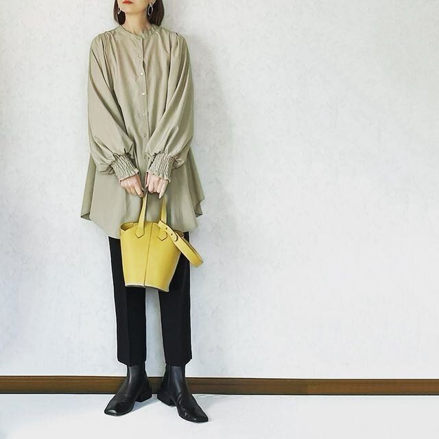 くすみグリーンのシャツは、大人女子の春コーデにおすすめ。コーデのアクセントにぴったりなマスタードカラーのバックがかわいい!