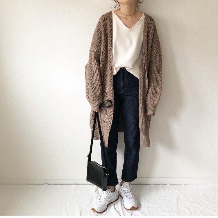 少しゆとりがあり、丸みもある優しい印象のハイウエストマムジーンズにロングカーディガンを合わせたコーディネートは縦長シルエットになるので、ゆったりとした雰囲気を残しつつも着やせ効果も期待できるリラックスコーディネート。春先の少し肌寒い日におすすめです。