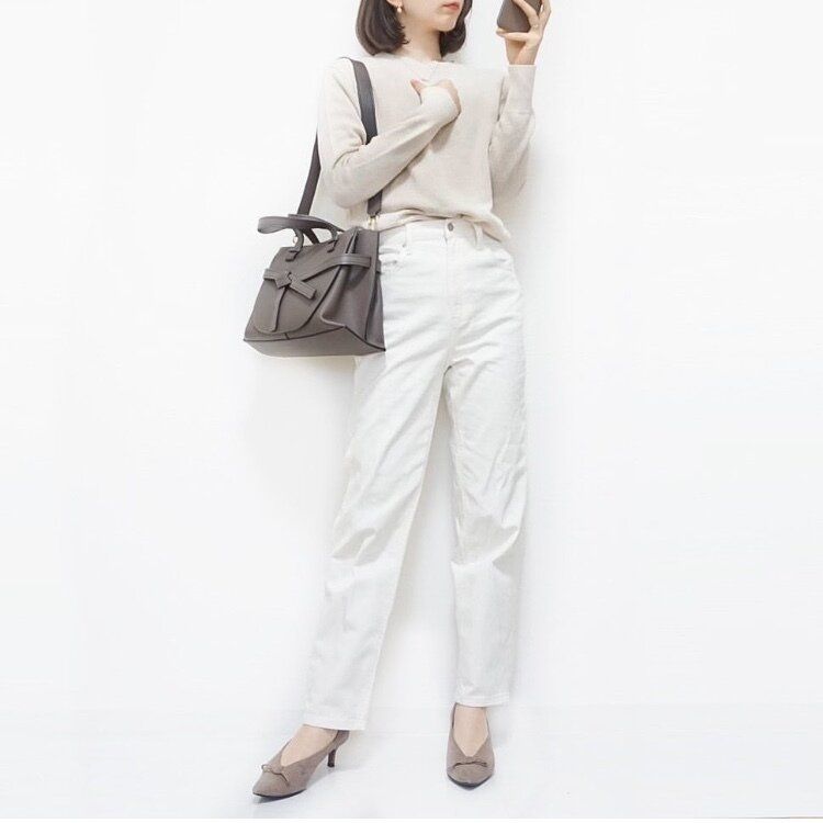カジュアルすぎるのは苦手、という人におすすめなのがホワイトのデニム。ホワイトの「GU・ハイウエストマムジーンズ」に淡いベージュを合わせたコーディネートは、上品な印象になるので、カジュアルすぎる服装を避けたい時にもおすすめです。