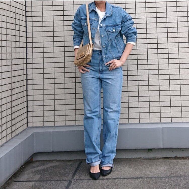 ハイウエストストレートジーンズはスキニーデニムよりも少しゆとりのあるデザインなので、トップスに合わせるデニムジャケットは丈が少し短めなもの選ぶとバランスがいいです。