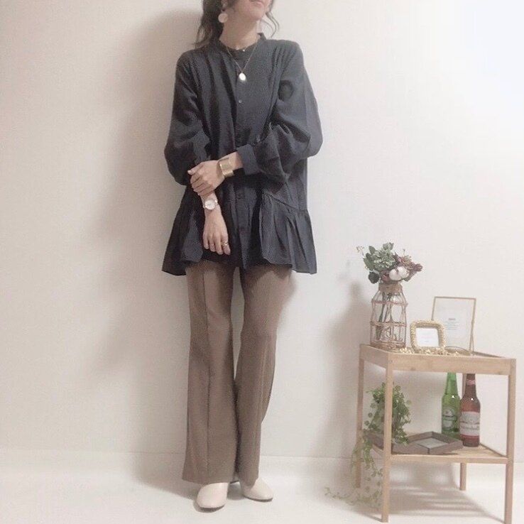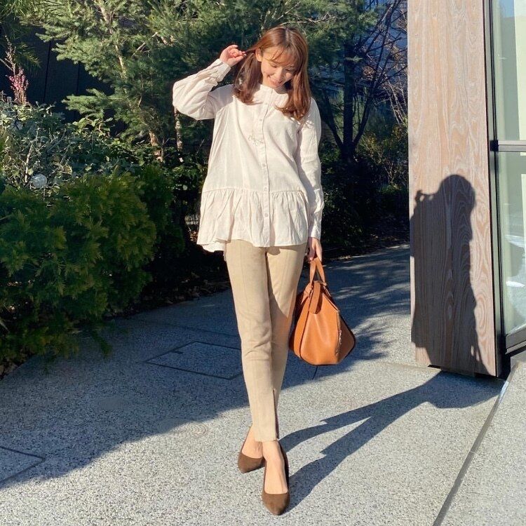 腰まわりにギャザーが入っているので、パンツは細身でメリハリのある組み合わせが人気です。