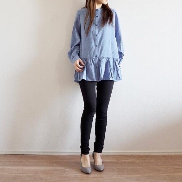 おしゃれ上級者さんに人気カラーの「ブルー」。定番の黒のスキニーパンツと合わせることで甘すぎない大人の女性でも真似しやすい、スタイリッシュなコーディネートが完成します。