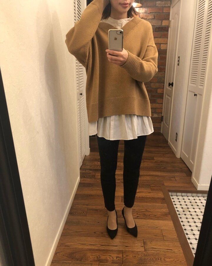 ニットを重ねて、フレア部分を少し出すことで、シンプルなコーディネートのアクセントになり、おしゃれなお出かけコーデに。