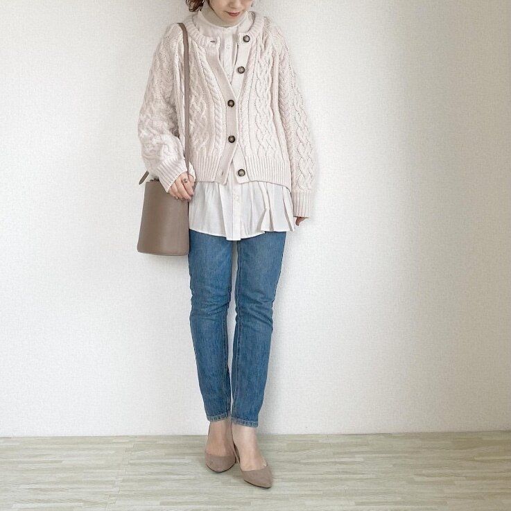 カーディガンを重ねたおしゃれ上級者コーデですが、着ている服はじつはクローゼットによくある定番アイテム。デニム、カーディガンにギャザーフレアロングシャツを合わせるだけで完成します。