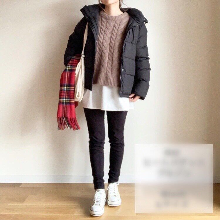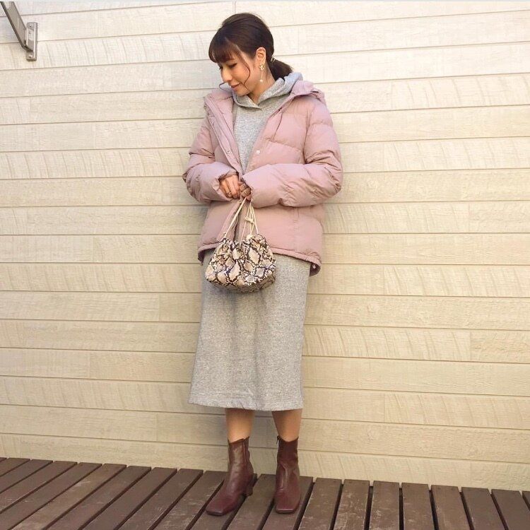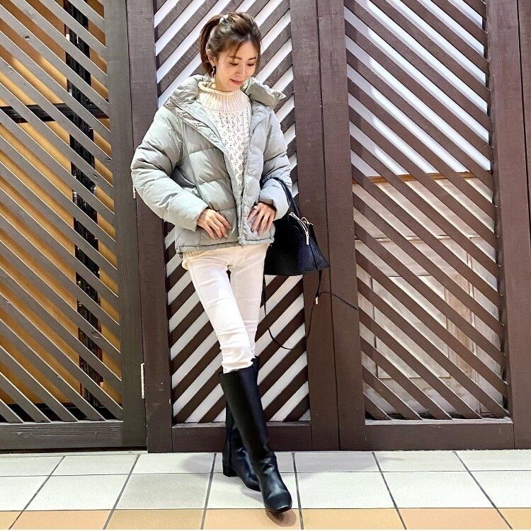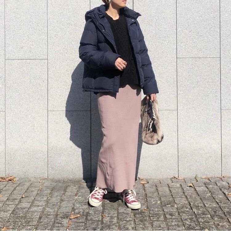 少しタイトなスカートをあわせることで、アウターのボリュームで着ぶくれすることもありません。アラフォーでも真似しやすいレディカジュアルなコーディネート。
